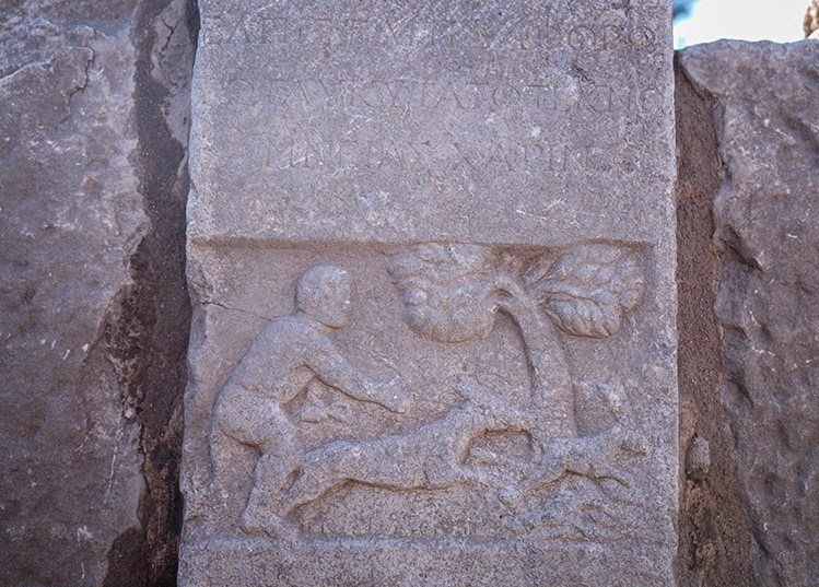 Sezgin, Mozaikli Ev’in avlusundaki havuzda mezar taşı kullanıldığını fark ettiklerini dile getirdi. Mezardan sökülerek havuzda kullanıldığını düşündükleri taşın üzerinde hüzünlü bir hikayenin betimlendiğini aktaran Prof. Dr. Sezgin, “Mezar taşında ‘dünyanın en tatlı çocuğu’ yazılı bir ifade var. Bir çocuk figürü, yanında köpeğiyle tavşan avına çıkmış halde betimlenmiş. Annesi tarafından yaptırıldığı anlaşılan bu taş, hem duygusal yönüyle hem de dönemin sosyal yaşamına dair ipuçları barındırıyor” diye konuştu.